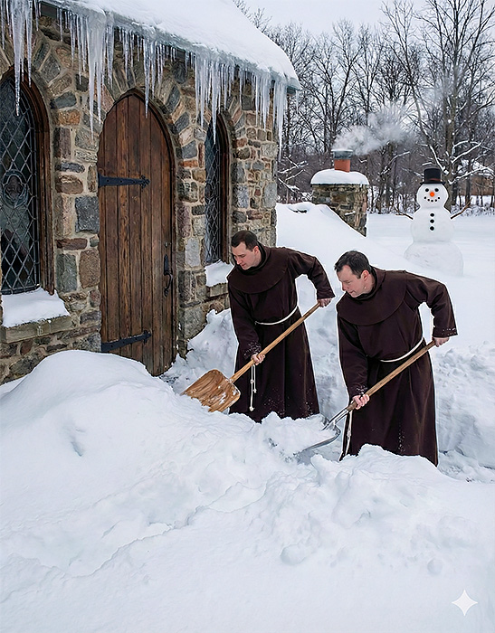 Starsi bracia wspominają, jakie to kiedyś były zimy i ile to śniegu napadało. Z każdą opowieścią śniegu przybywa, a i łopaty są coraz większe.